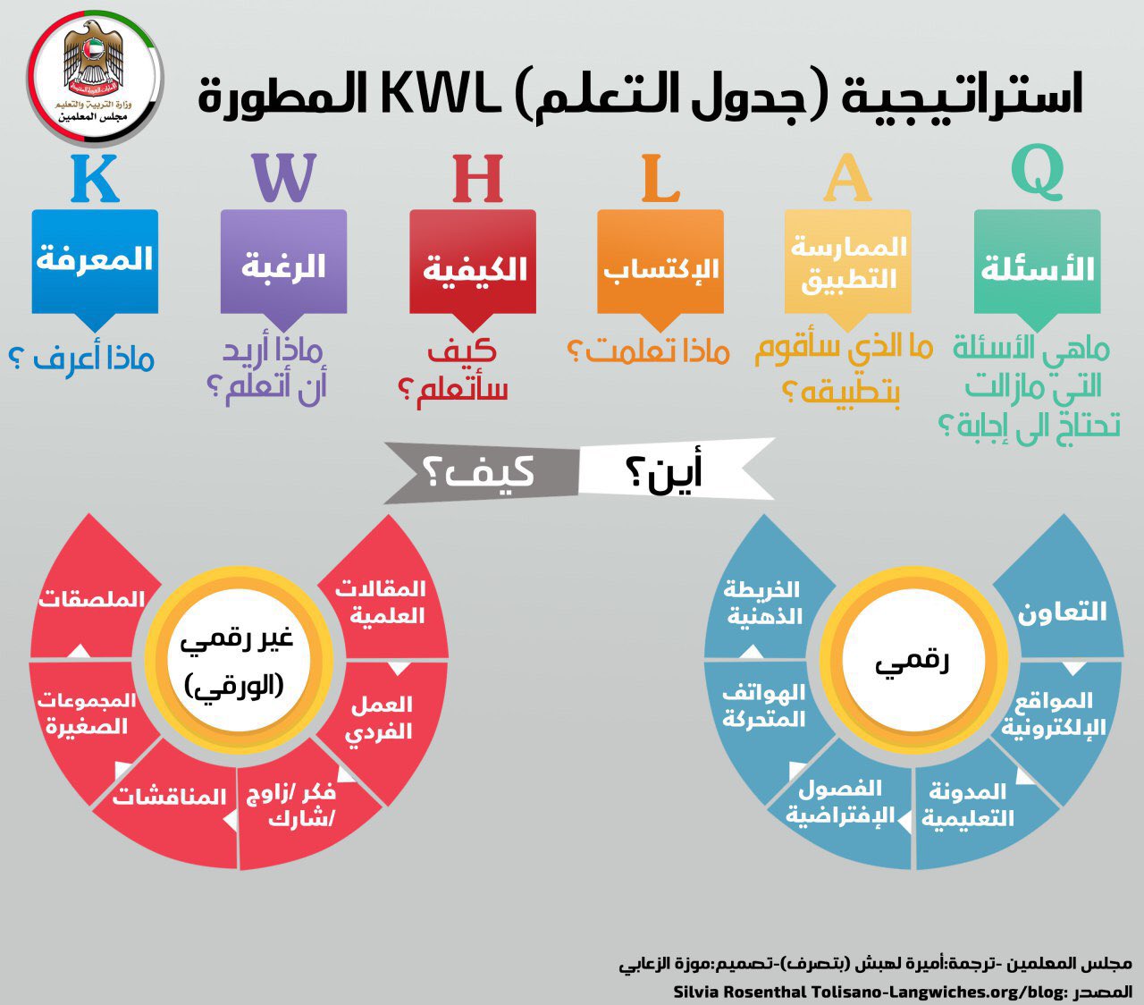 يندرج هذا النموذج التدريسي تحت نماذج التعليم المعرفية. التعليم الذاتي هو الافضل لترسيخ المعلومات انطلاقا من هذا المبدا تم تفعيل جدول التعلم الذاتي في درس مادة العلوم الحيوانات لتقيم الطالبة معرفتها القبليه بمعلوماتها عن الحيوانات و ماذا. ما هي استراتيجية kwl طالب علم في أي مرحلة كنت في المدرسة أو الجامعة أو إن كنت باحثا أو معلما يرغب في تعليم طلابه.
